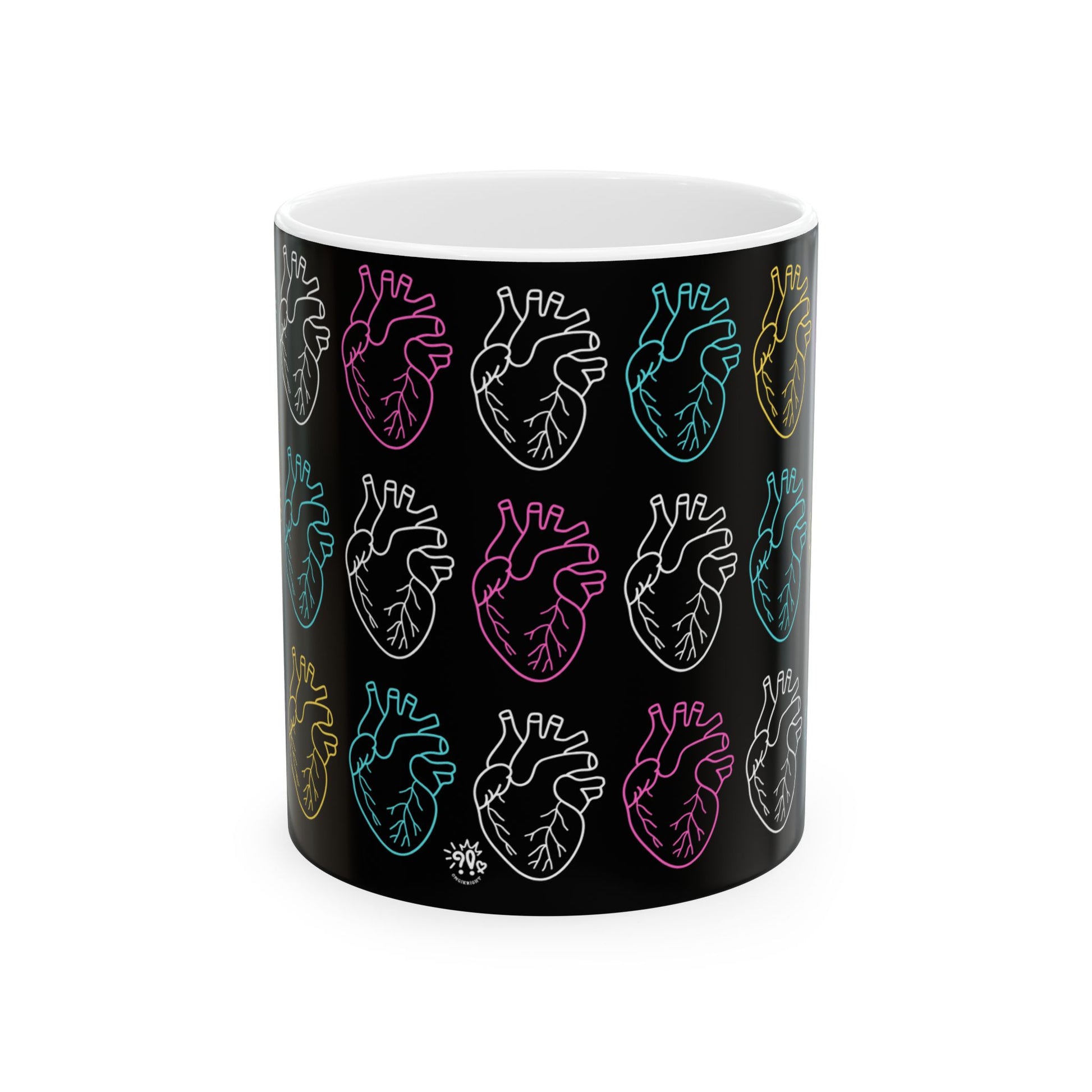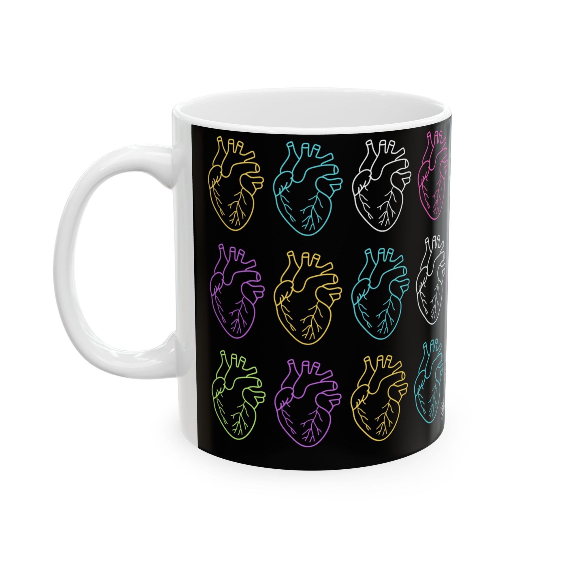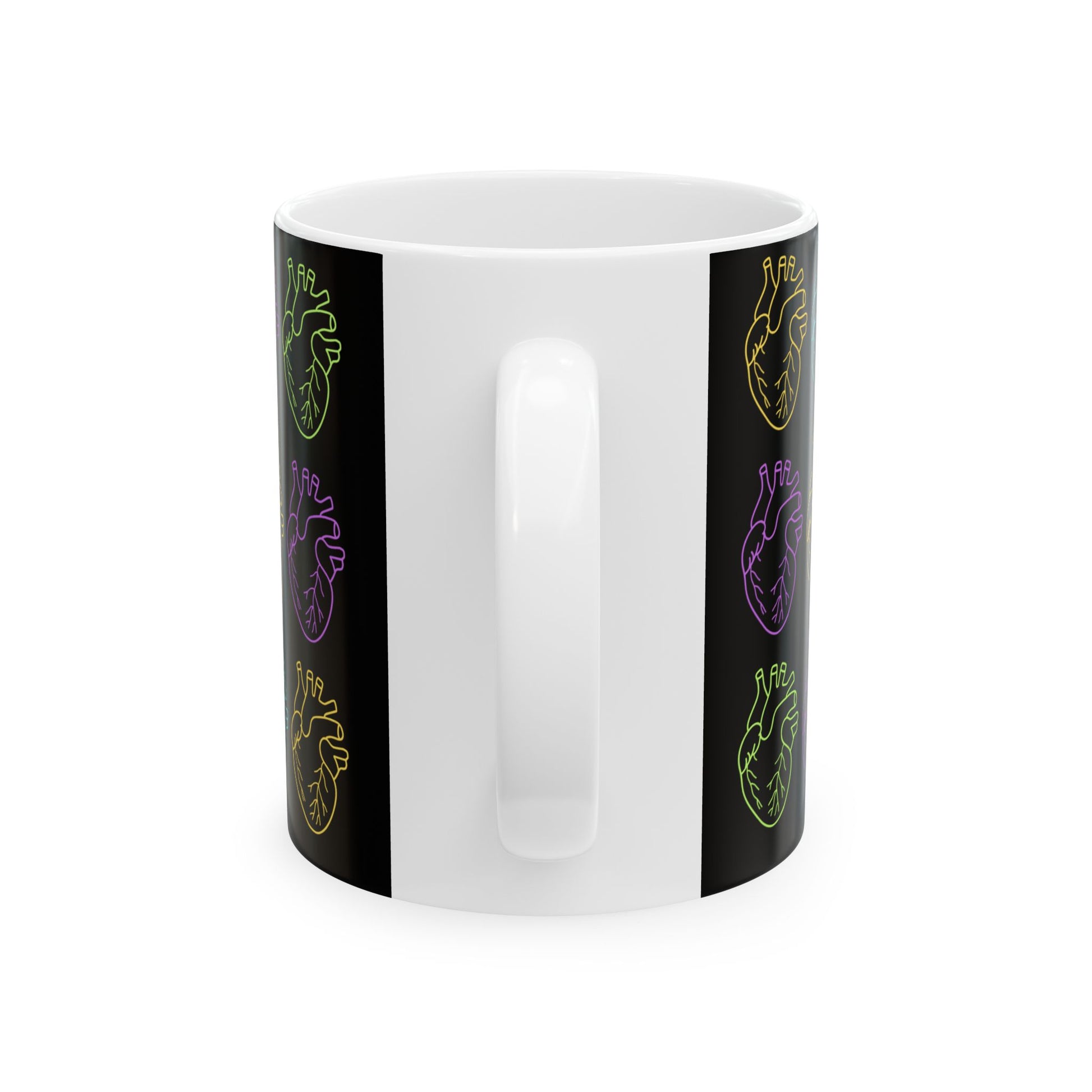 Bold. Rhythmic. Electric. This black-wrap ceramic mug features stacked anatomical hearts outlined in neon tones—yellow, white, purple, blue, and green. It’s a visual pulse, a creative current, a reminder that your heart isn’t just beating—it’s broadcasting.