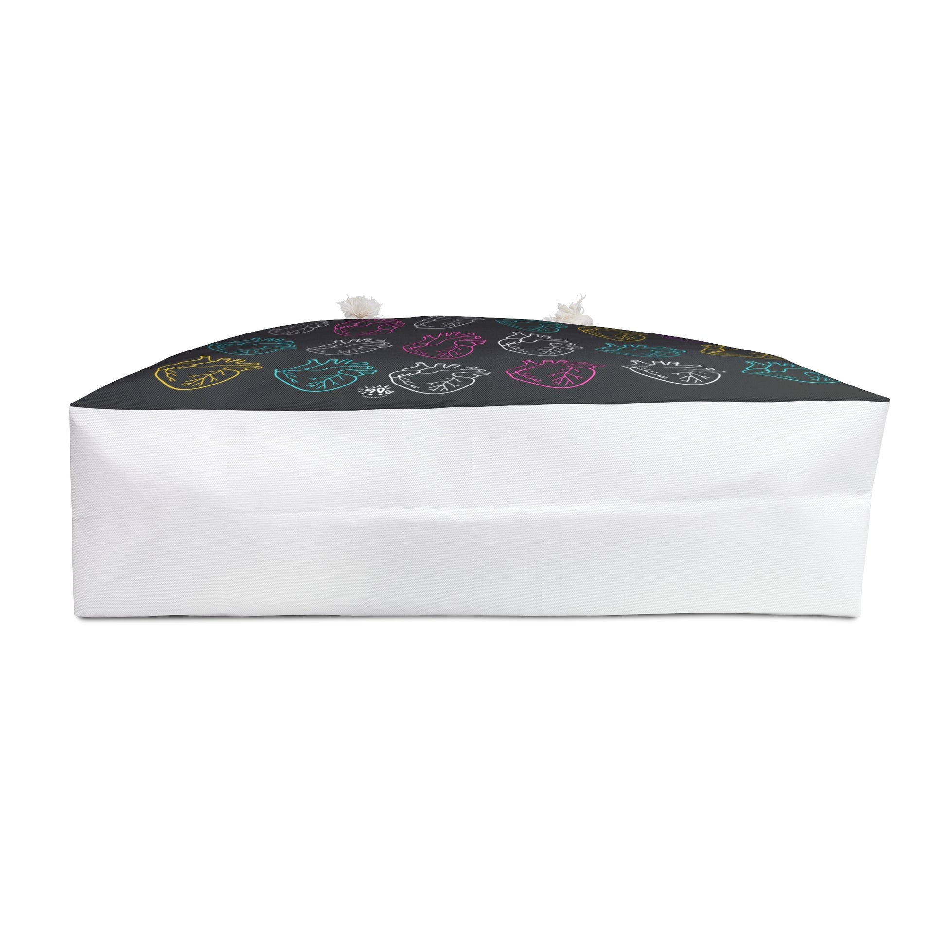 This oversized weekender features a stacked cascade of cartoon anatomical hearts—outlined in electric hues against a black canvas, like a pulse in motion. It’s bold, layered, and emotionally charged. Whether you're heading out for a creative retreat or just need a carryall that holds your rhythm, this bag is built to travel with feeling.