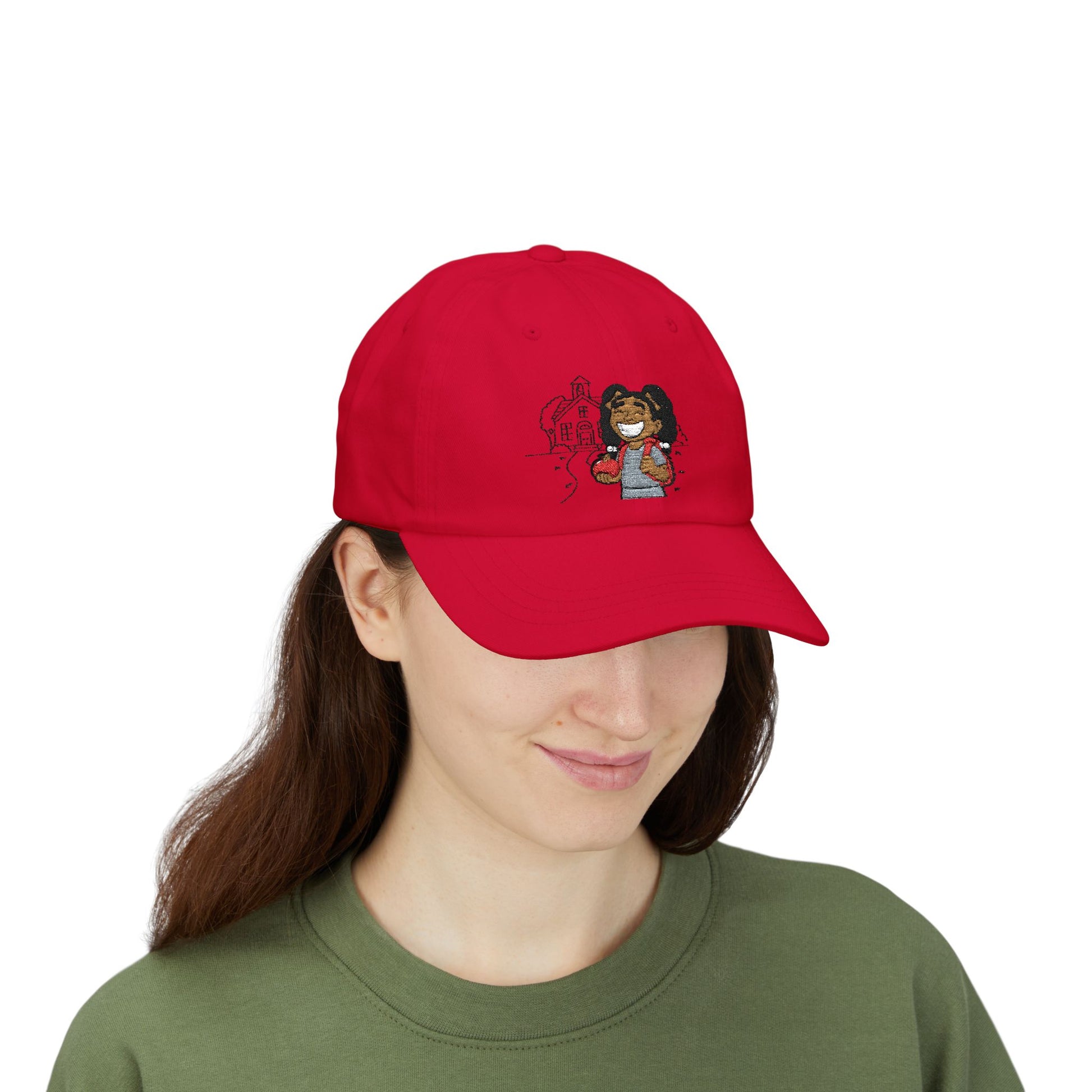 This soft cotton cap features a stitched image of a little girl standing in front of a school, backpack on and apple in hand. It’s a nod to those early sparks of wonder: reading the encyclopedia for fun, wandering science stores, and asking questions.